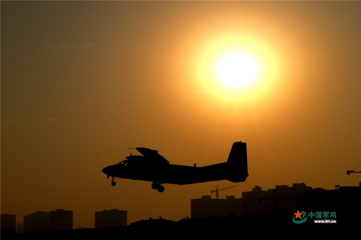 满载跳伞员的战鹰迎着朝阳起飞。戚勇强 摄