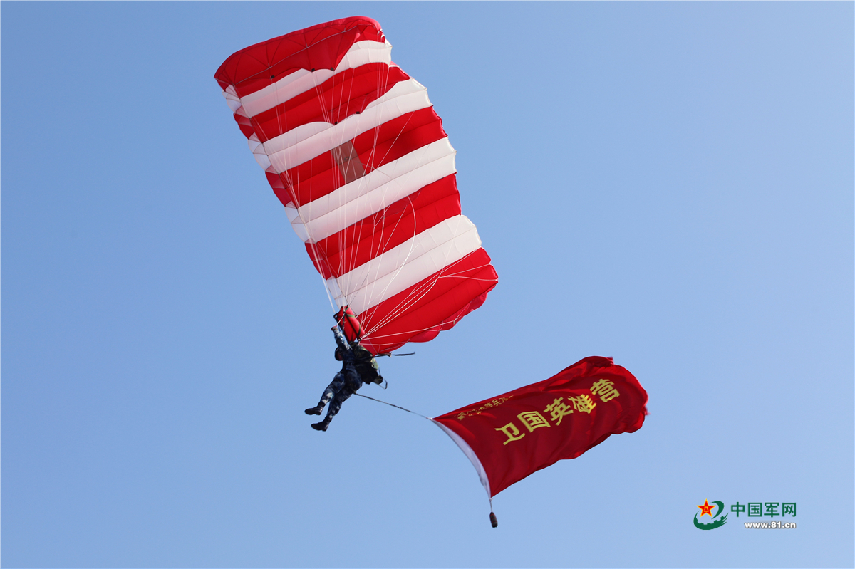 携带营旗的跳伞员从天而降。戚勇强 摄