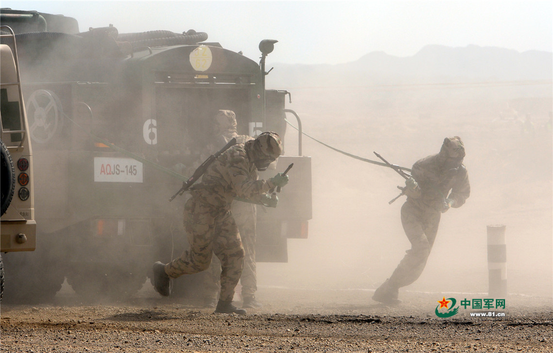 “国际军事比赛-2017”,中国新疆库尔勒赛区,“安全环境”比赛项目,单车赛中创造中国速度的中方车组对受染装备进行洗消。吴苏琳摄影