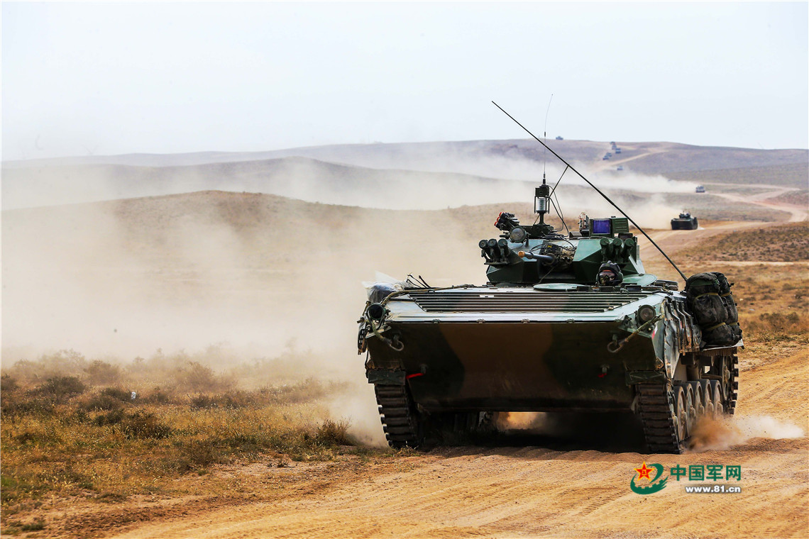“火力-2017·青铜峡”基地化训练,装甲部队迅速向“敌”前沿机动。王磊 摄影