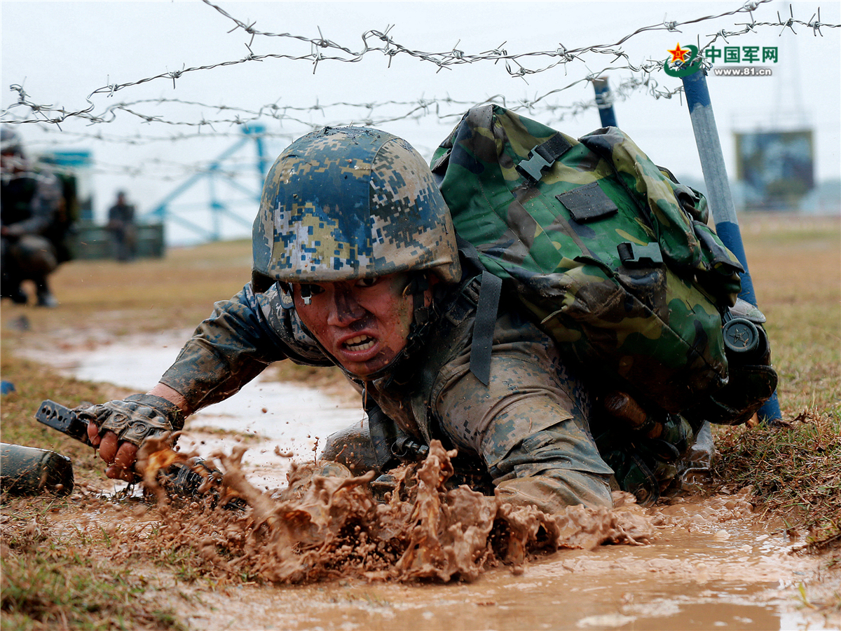陆战队员匍匐穿越铁丝网。梁景锋 摄