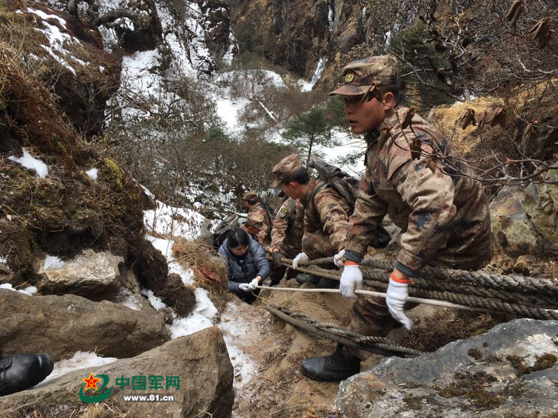 边防官兵护卫记者攀上险坡。