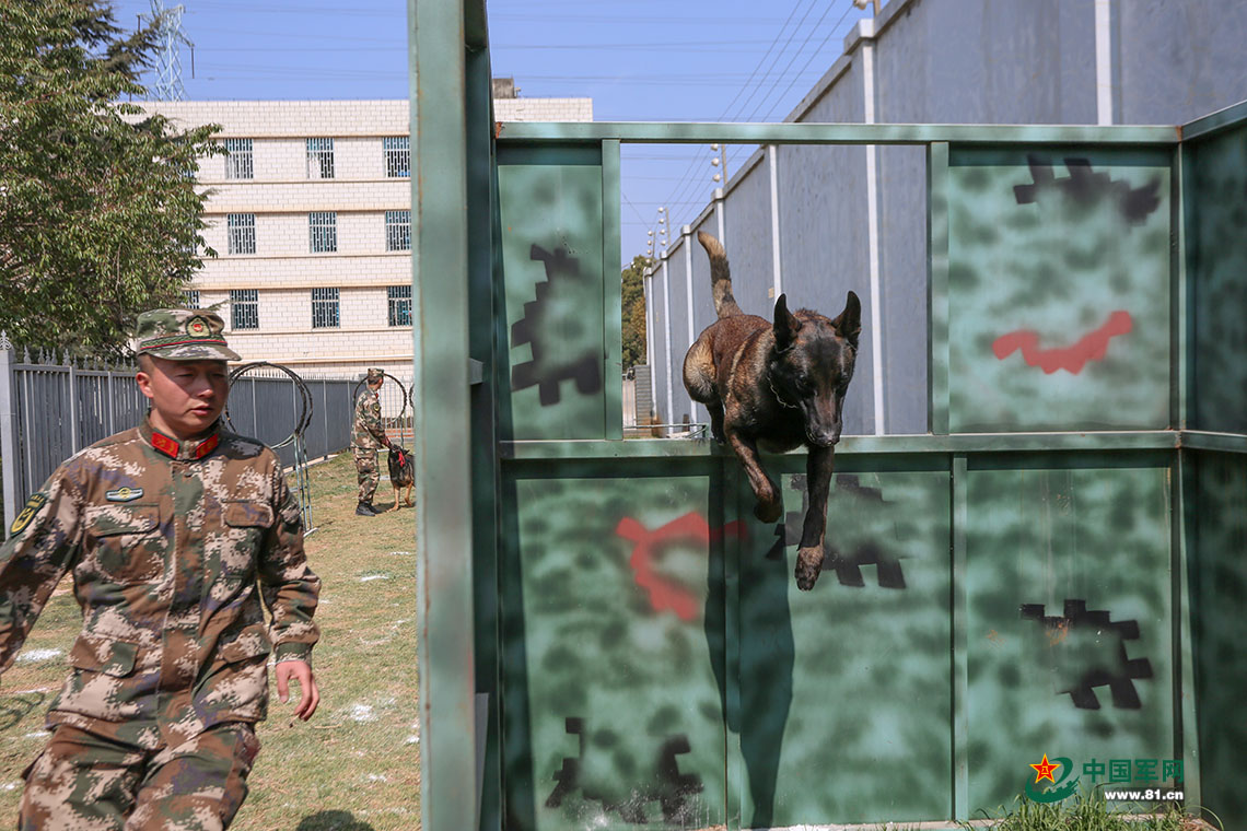 警犬“黑帝”正在进行跳高墙训练。胡程 摄