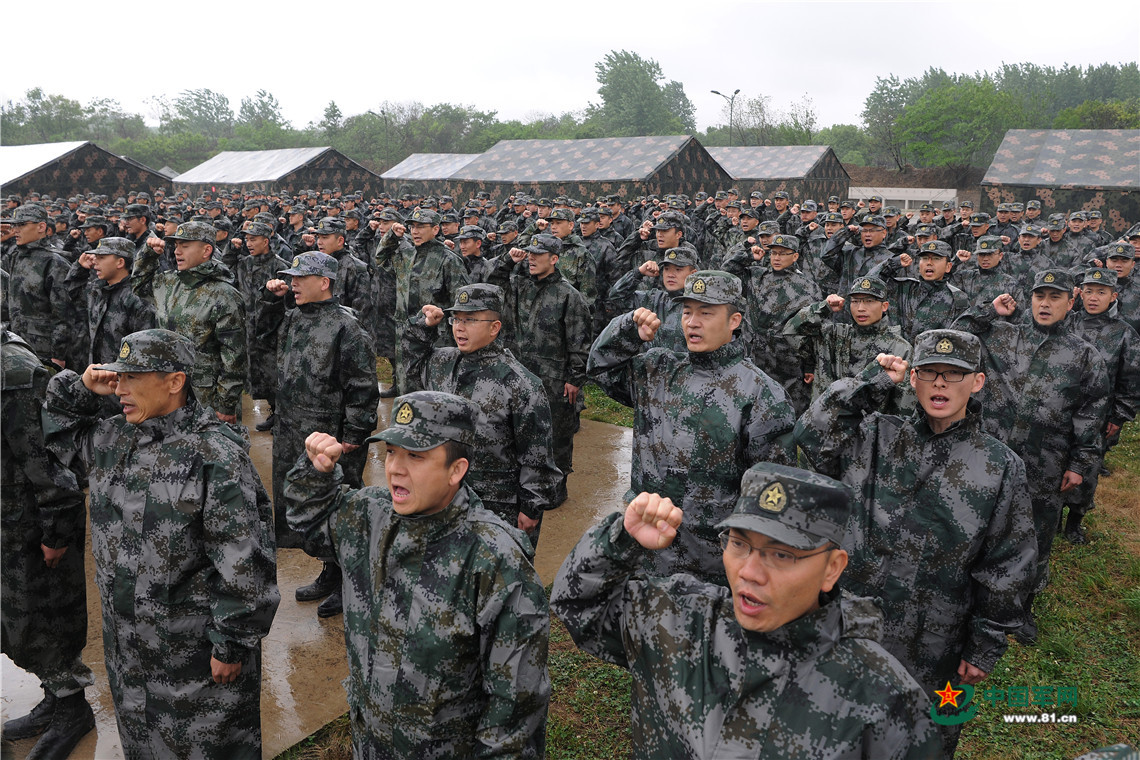 4月23日,陆军首次战役参谋比武竞赛动员,参赛人员向军旗宣誓。彭希摄影