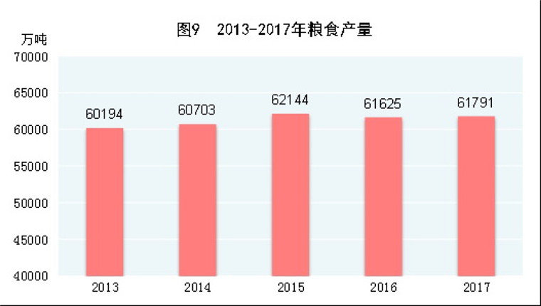 全年粮食产量61791万吨,比上年增加166万吨,增产0.3%。其中,夏粮产量14031万吨,增产0.8%;早稻产量3174万吨,减产3.2%;秋粮产量44585万吨,增产0.4%。全年谷物产量56455万吨,比上年减产0.1%。其中,稻谷产量20856万吨,增产0.7%;小麦产量12977万吨,增产0.7%;玉米产量21589万吨,减产1.7%。