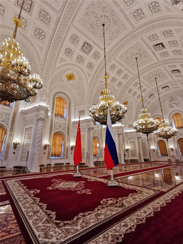 △普京总统在克里姆林宫乔治大厅为习主席举行隆重的欢迎仪式,大厅以白色和金色为基调,顶部有六个巨大的水晶吊灯。(央视记者李铮拍摄)