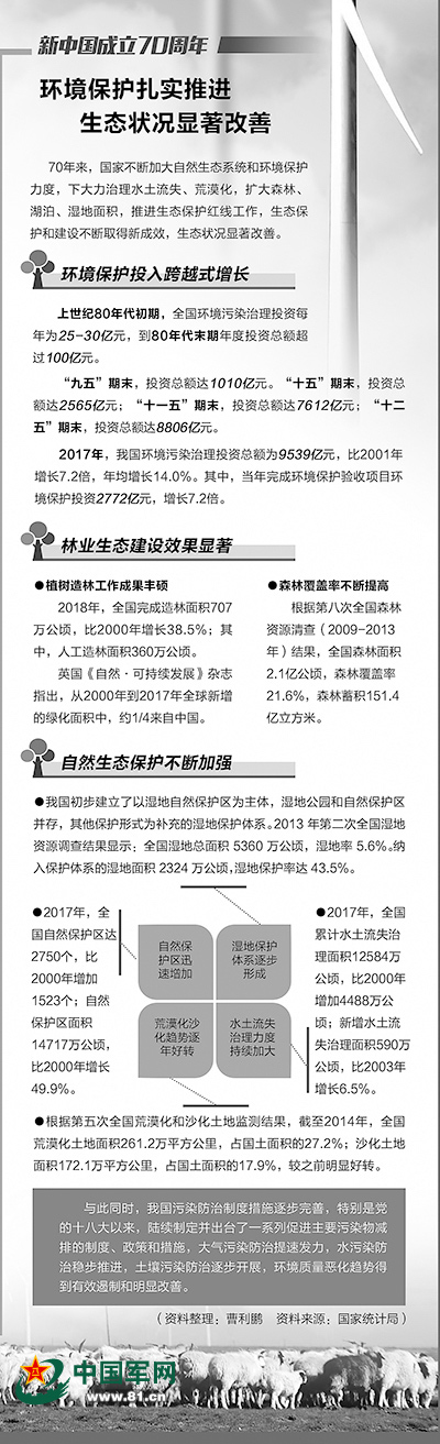 新中国成立70年来,民众从盼温饱到盼环保、从求生存发展到求生态美好,为新时代搞好生态文明建设增添了新力量。人们欣喜地看到,从成建制投入兵力的人力优势,到依托创新驱动的科技发力,人民军队已在生态文明建设的许多方面实现了“零的突破”。