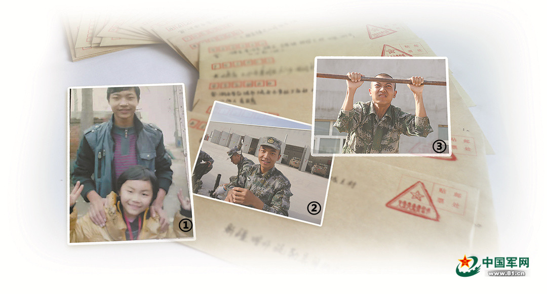 图①:2009年,王焯冉接妹妹从幼儿园回家,二人在父亲养鸡场外的合影。图②:2018年,刚转士官的王焯冉带领全班保养武器。图③:2017年,王焯冉参加连队体能小比武,拼尽全力为全班争荣誉。底图:王焯冉和战友们写下的家信。纵 恒提供