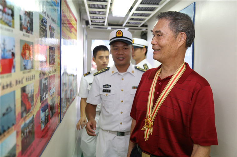 麦贤得参观第三代海上英雄艇,驻足观看艇队通道文化。王付锟 摄