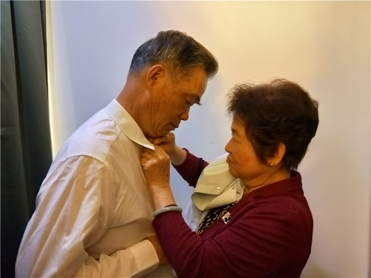 2018年5月,李玉枝陪同丈夫麦贤得赴北京参加强军故事会,活动前李玉枝细心帮助丈夫整理军装。图片由李玉枝本人提供