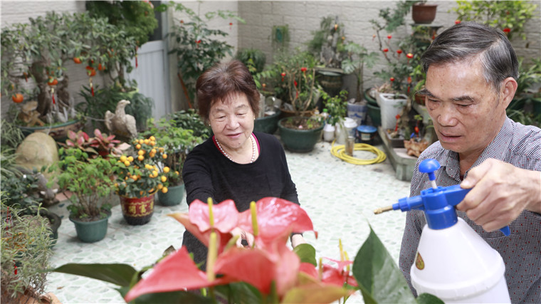 李玉枝麦贤得在家中小院浇花。王付锟 摄