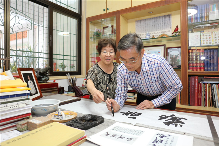 李玉枝陪同丈夫麦贤得在练习书法。王付锟 摄