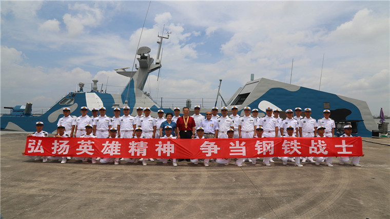 麦贤得夫妇与海上英雄艇官兵合影。王付锟 摄