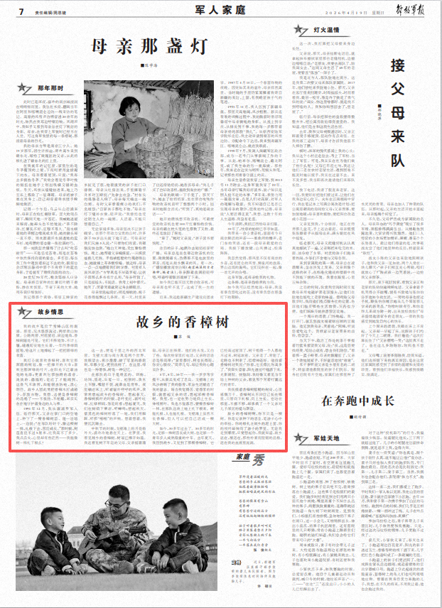 3年,5年,10年……我一步步考学提干,从新兵变成了老兵。戈壁滩上的风沙磨砺了我的筋骨,军旅生活锻造了我的意志。每当我觉得苦、觉得累的时候,就想起父亲的话,想起那棵香樟树。我想,它一定在努力地向上生长,伸枝展叶。我也不能落后,要像香樟树一样,在部队这块土地上扎下根来。树能扎根,人也能扎根。戈壁滩上虽然不长香樟,但人可以把自己活成一棵大树。