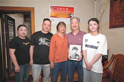 林树林(右二)手捧父亲肖像和家人合影。戴伟国摄