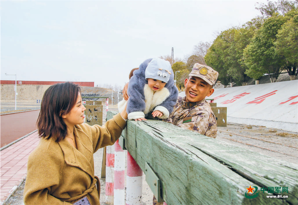 近日,新疆军区某部中士安乐的家人来队探亲。图为安乐和妻儿在一起。刘锦涛摄
