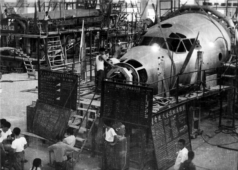接到运-8运输机生产任务时,工厂基础建设刚刚起步,尚不具备生产条件。为了使这架飞机尽早研制成功,需要砍柴搭草棚建造临时生产车间。