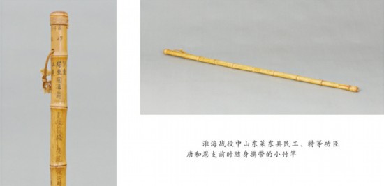 解放战争中,人民解放军的交通运输条件十分落后,广大人民用肩挑、车推、驴驮、船运等方法,从千里之外将大量的粮食、弹药等军需物资源源不断地运到前线,将伤病员送往后方医治。在中国共产党历史展览馆陈列着一件山东农民唐和恩千里支前路上使用过的小竹竿,小竹竿长106cm,直径约为2.5cm,属国家一级文物,是山东省莱东县支前民工唐和恩在支前路上支撑走路使用的。支前道路崎岖,唐和恩走累了就拿小竹竿当拄棍,遇有河流阻挡,就用小竹竿来探深浅,风雪淤泥中用小竹竿寻道路。有时候遇到国民党军的轰炸,他就在小竹竿上绑上树枝和茅草伪装防空;翻山越岭他就把小竹竿高高举过头顶在最前面引路。战役中,唐和恩几乎跑遍了整个淮海战场,每到一地,他就把地名刻在小竹竿上,共刻下了山东、安徽、江苏3个省88个城镇和村庄的名称,行程长达5000余里。一件小小竹竿铭刻了伟大的支前路,也充分显示了人民战争的巨大威力。