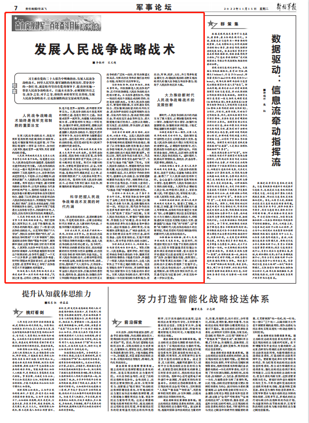 习主席在党的二十大报告中明确指出,发展人民战争战略战术。回望人民军队强军制胜的光辉历程,贯穿其中的一条红线,就是始终坚持在党的领导下,提出和实施一整套人民战争战略战术。打赢未来战争,必须紧盯科技之变、战争之变、对手之变,赓续传承好我军优良传统,发展人民战争战略战术,让克敌制胜的法宝显威现代战场。