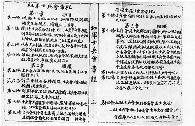 1930年夏,毛泽东、朱德领导的红军在总结士兵委员会(士兵会)建设实践的基础上,制定了《红军士兵会章程》。章程共分6章35条,对士兵会的宗旨、职权、组织、工作、经费等问题作出明确规定。