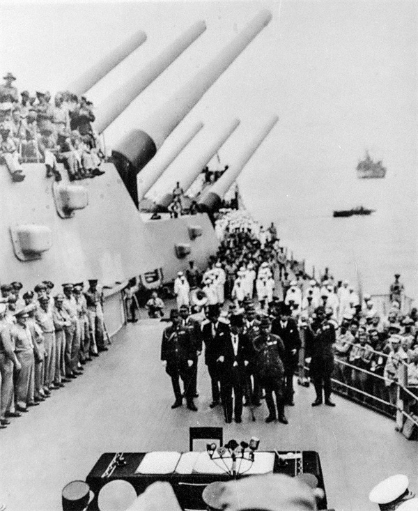 1945年9月2日,日本代表在东京湾美国“密苏里”号战列舰上签署投降书。