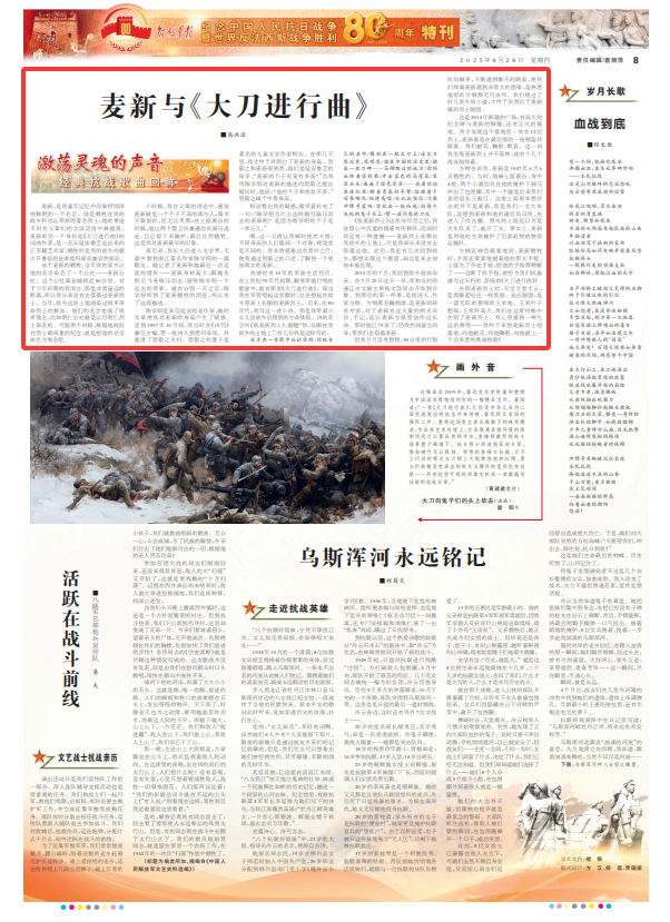 方纲还神色凝重地说,麦新牺牲时,手里还紧紧地握着他的那支手枪。土匪为了夺走手枪,把他的手指都掰断了——这断了的手指,曾经为我们民族谱写过不朽的、昂扬的《大刀进行曲》!