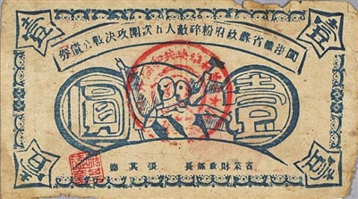 在浙江省博物馆,珍藏着一张发行于1934年的闽浙赣省苏政府粉碎敌人五次围攻决战公债券。这张公债券长14.3厘米、宽7.8厘米,正面为黑色油墨印刷,主体为旗帜下的工农人物版画,加盖“中华苏维埃共和国闽浙赣省苏财政部”公章,两侧圆圈内印有壹圆面值,下方落款为“省苏财政部长 张其德”及篆体印章。背面印有“发行决战公债条例”,说明发行目的、用途等,落款为闽浙赣省苏维埃政府。
