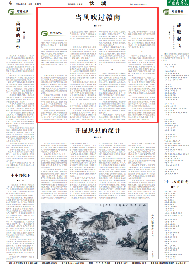 当风吹过赣南,深情传颂着中国共产党人和红军将士用生命和热血铸就的伟大长征精神。穿越历史的沧桑巨变,伟大长征精神从未远去,它藏在这永远滚烫的风里,激励着一代又一代人在新长征路上砥砺前行。
