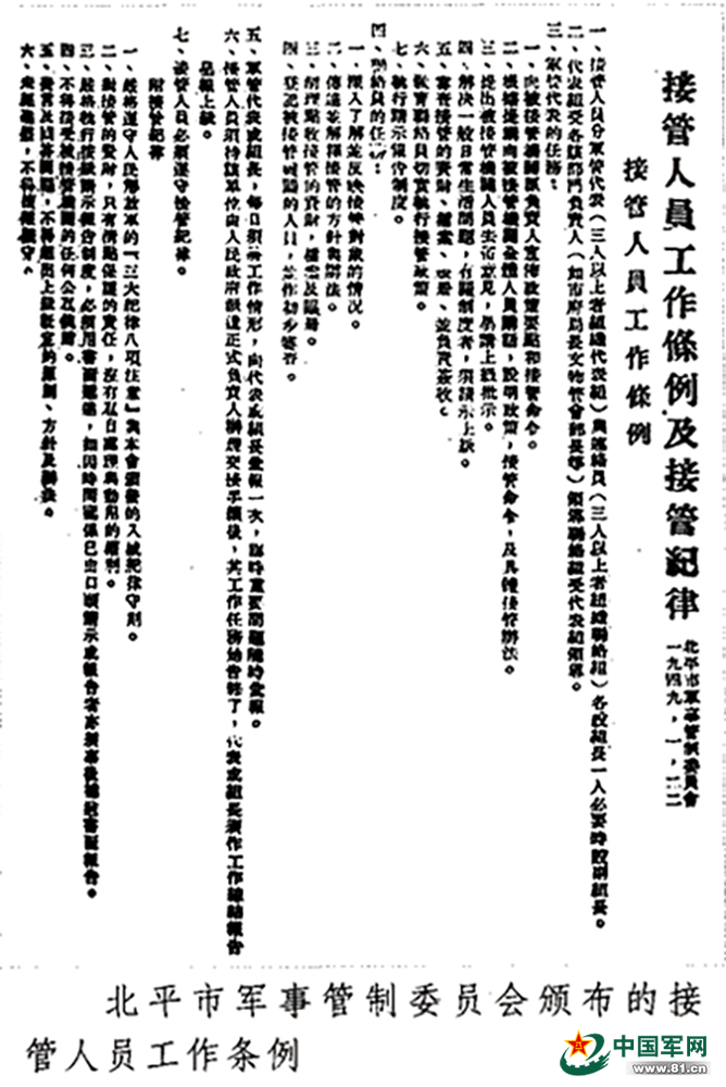 北平市军事管制委员会颁布的接管人员工作条例。资料照片