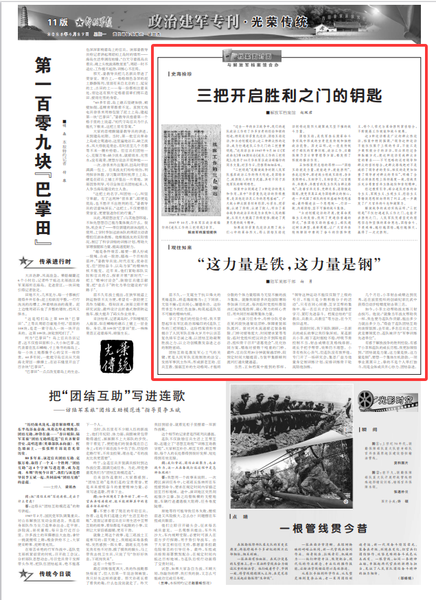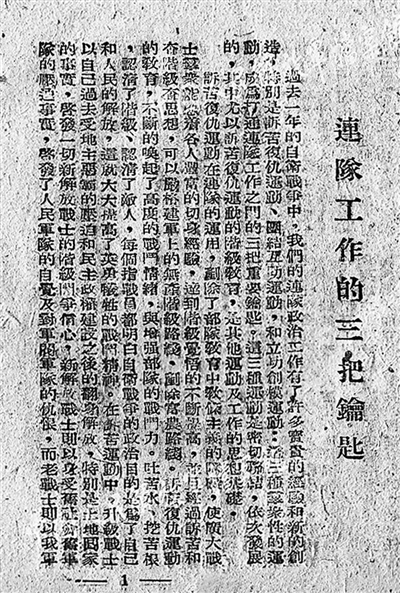 “过去一年的自卫战争中,我们的连队政治工作有了许多宝贵的经验和新的创造,特别是诉苦复仇运动、团结互助运动,和立功创模运动:这三种群众性的运动,成为打通连队工作之门的三把重要钥匙。”这段话出自1947年9月30日《军政杂志》第18期社论《连队工作的三把钥匙》,收录于10月华东军区政治部编印的同名文集,时至今日,仍值得细细品味。