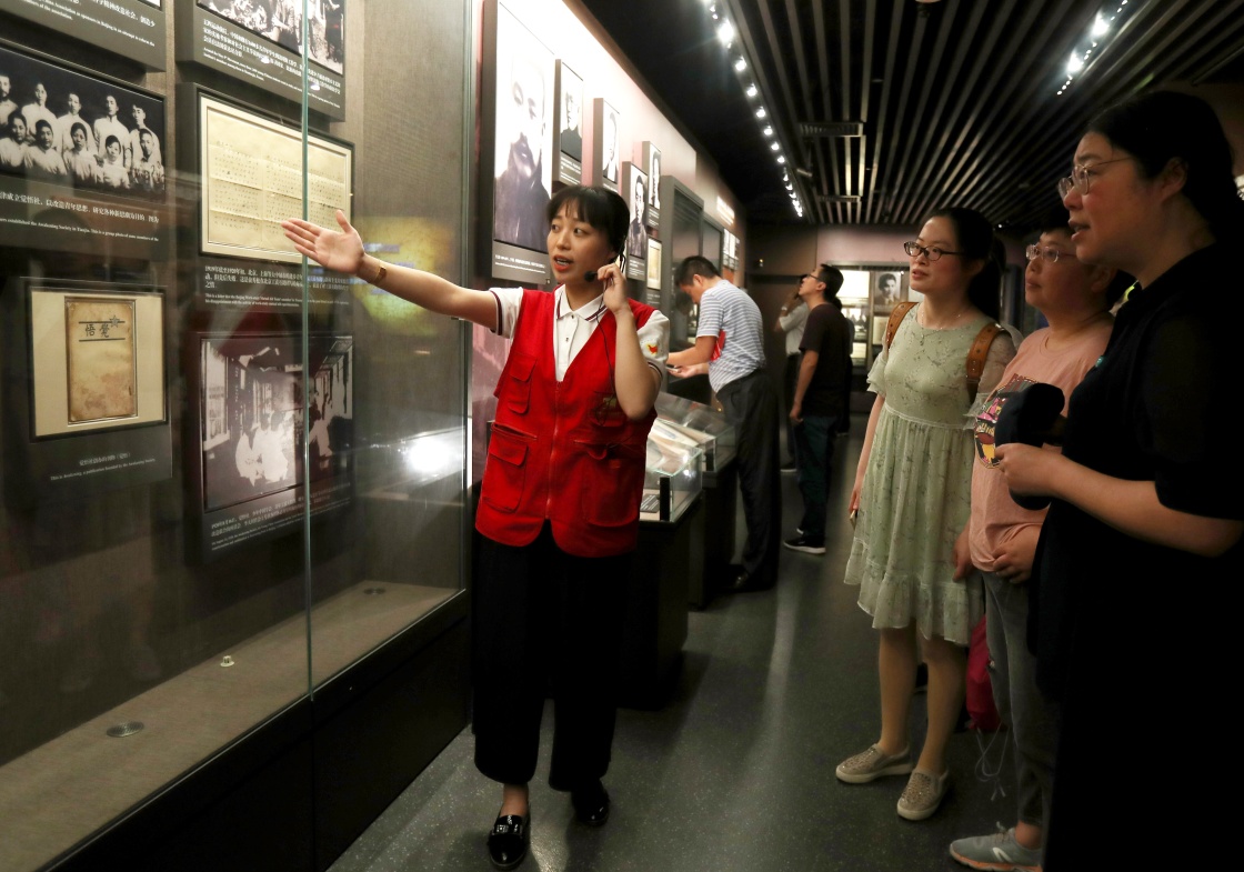 1月20日,“党的诞生地”志愿服务队队员、上海大学的学生在中共一大会址纪念馆为观众进行讲解(2019年6月22日摄)。新华社记者 刘颖 摄
