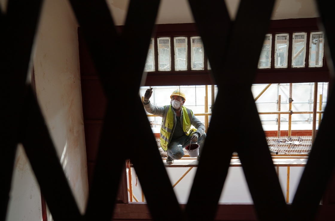2021年1月14日,工人在修缮现场施工。2020年11月17日起,中共一大会址及原展厅暂停对外开放实施修缮改造。新华社记者 刘颖 摄