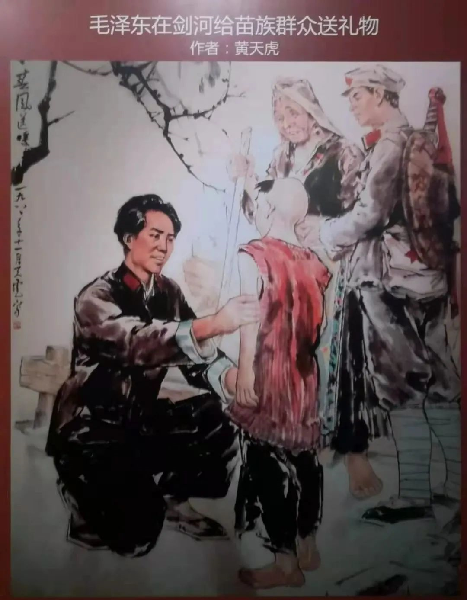 “当我等行经剑河县附近之某村落时,见路边有一老妇与一童子,身穿单衣,倒于路边,气息尚存……正询问间,赤军领袖毛泽东至,告以老妇所言。当时毛即时从身上脱下毛线衣一件及行李中取出被单一条,授予老妇,并命人给以白米一斗。老妇则连连道谢含笑而去。”