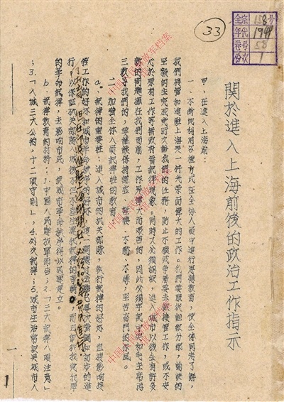 1949年5月8日,华东军区直属党委印发的《关于进入上海前后的政治工作指示》(局部)。解放军档案馆藏