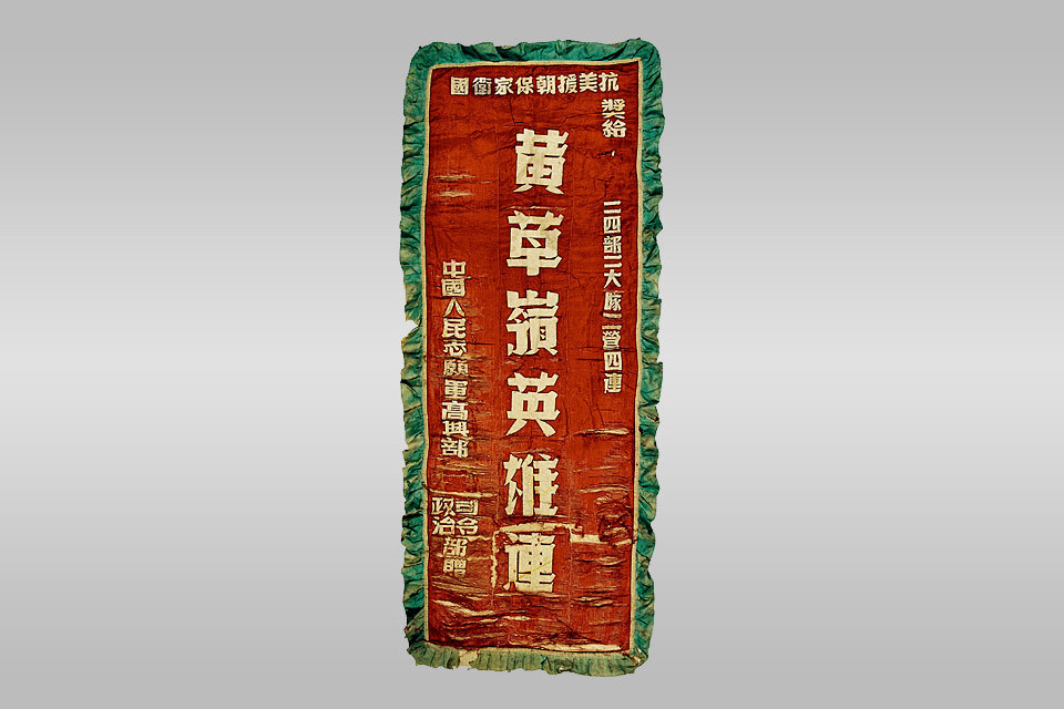 这是志愿军某部颁发给三七〇团四连的“黄草岭英雄连”奖旗。黄草岭位于朝鲜长津湖以南约20千米,是志愿军的前沿阵地。1950年10月25日,志愿军四十二军为阻击东线之敌,派先头部队抢占黄草岭,随后该军三七〇团四连奉命守卫黄草岭796.5高地。10月28日和29日,四连在守卫黄草岭战斗中共击退敌人进攻20次,毙伤敌军250余人。战后,四连被授予“黄草岭英雄连”称号,并获赠奖旗。