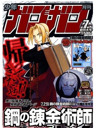 《钢之炼金师》是荒川弘于2001年开始在Square-Enix旗下杂志《月刊少年GANGAN》上连载的少年漫画,于去年完结,共推出108话。作品因其宏大的世界观和大气的故事构架,一经推出便大受粉丝欢迎。05年第一部剧场动画已上映,反响良好。《钢之炼金术师》的第二部剧场版:《钢之炼金术师 叹息之丘(米洛斯)的神圣之星》也即将在今年7月2日上映。《钢之炼金术师》的粉丝,不论是已经开载的新作短篇,还是即将上映的剧场动画,都千万不要错过~