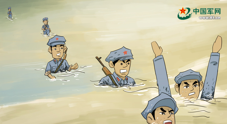 红军战士喜出望外,赶到浅滩处后,团参谋长和几个会泅水的侦察兵,下水试渡。大家站在岸上,瞪大眼,屏住呼吸,望着这批人下水。快涉到江心时,水才淹没到胸脯,大家高兴极了。可是,刹那间,水淹过了他们的肩膀和脖子,只有头和高高伸向空中的两只手露出水面。眼看着江水就要把他们吞没了,大家焦急万分,突然,参谋长往上一冒,又露出了肩膀,越往前走水越浅了。试渡成功了,岸上响起一片欢呼声。