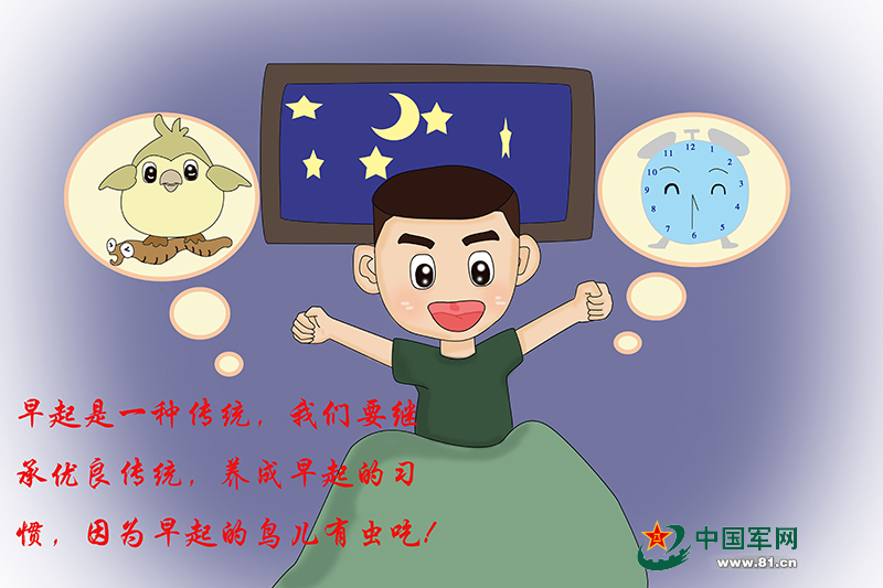 2、在咱部队大家庭,早起是一种传统,我们要继承优良传统,养成早起的习惯,因为早起的鸟儿有虫吃哦。