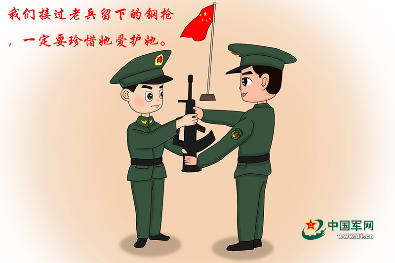4、“我宣誓,像爱护自己生命一样爱护武器装备,严格武器管理规定,正确操作使用武器装备,保守武器秘密,确保武器装备安全”;我们接过老兵留下的钢枪,一定要珍惜它爱护它。
