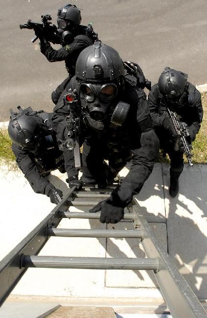 图为一身反恐装备的SASR士兵进行入室作战演练,使用反恐部队常见的MP-5冲锋枪。