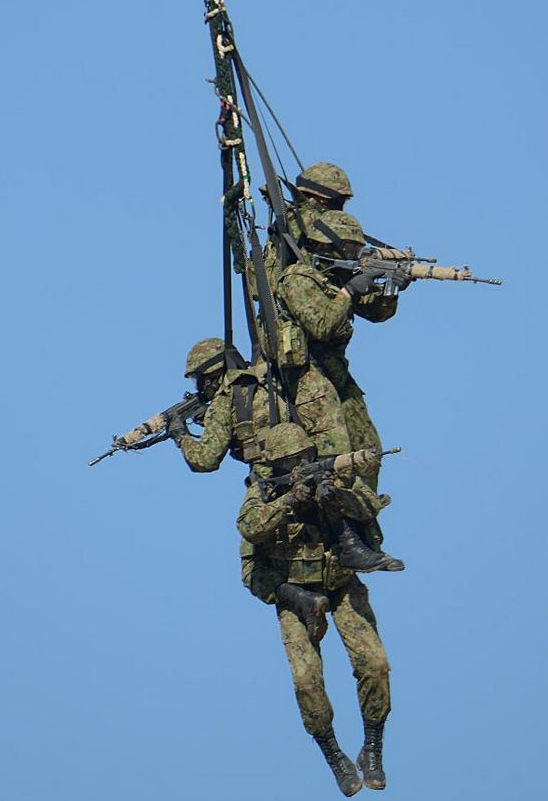 从CH-47运输直升机上吊下保持持枪姿势的队员