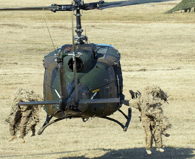 低空飞行的UH - 1直升机和进行伪装的队员