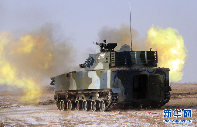 1月25日上午,海军陆战队某旅在沈阳军区某训练基地进行了火炮实弹射击演练。图为某型122毫米两栖自行榴弹炮进行射击。(郑文浩 摄)