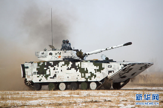 行进中的我陆战队某型两栖突击车,在这次寒区演练中该辆车特别涂装了适用于当地环境的雪地数码迷彩。记者在采访的过程中,有一些同行都把它叫做“坦克”。从外形以及使用特点上来看,这种突击车和坦克确实有很相似的地方,但这种突击车重量、火力、火控等系统和我军主战坦克都有一定差异,这体现了两栖部队抢滩登陆向纵深突击作战与传统重装陆军的区别。