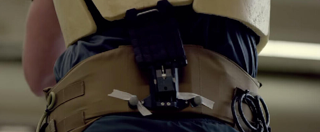上半身的护甲通过柔性支撑结构将重量转移到腰部下方的外骨骼上,减轻了战士的负重。