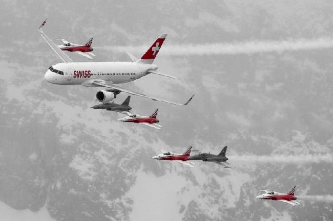 一架空客A320与瑞士空军飞行表演队的6架F-5E战机在雪山之巅做飞行表演。