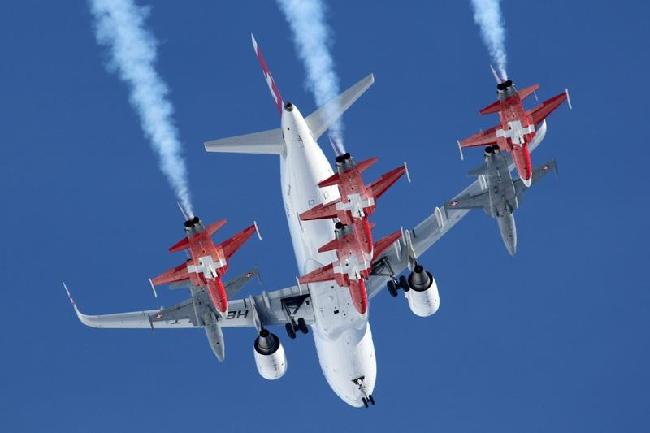 瑞士国际航空公司(The Swiss International Air Lines)的客机和它的“护航机队”上个月在劳伯角国际滑雪比赛上表演了编队飞越伯尔尼高地稳根度假村。