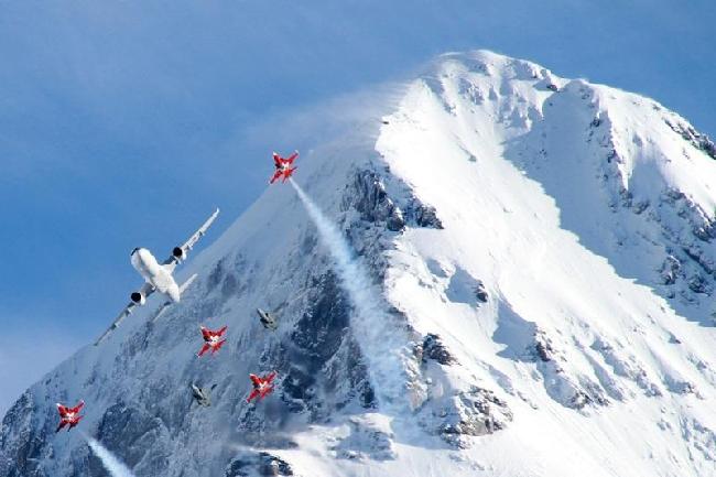 由于客机机身庞大,灵活性难以与动作敏捷的战机相比,能与5架战机编队飞行表演,不得不佩服该客机驾驶员的技术和训练水平。