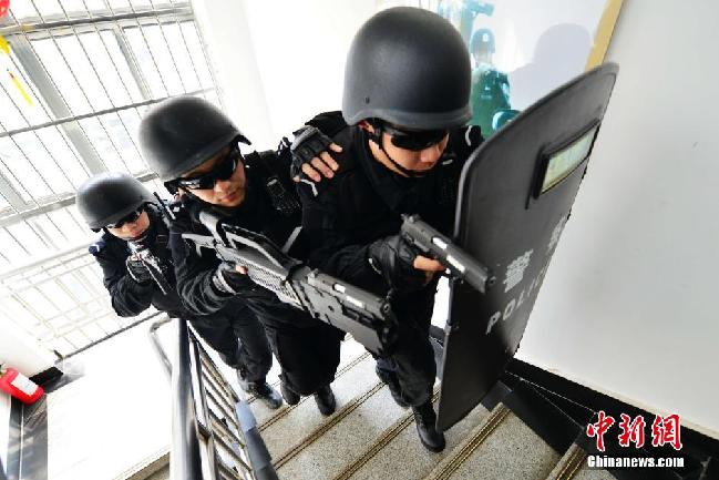 2015年3月3日,上海虹口区特警正在使用新式“拐弯枪”进行训练。 中新社发 沈春琛 摄