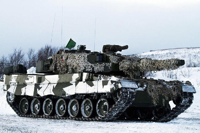 近日,挪威陆军举行了“联合海盗2015(Joint Viking 15)”演习,演习中挪威陆军出动了精锐的德制豹2A4主战坦克进行野外行军、实弹射击等训练。采用白色雪地迷彩伪装的豹2A4坦克,进入丛林时与周围环境浑然一体,远距离很难用肉眼发现。
